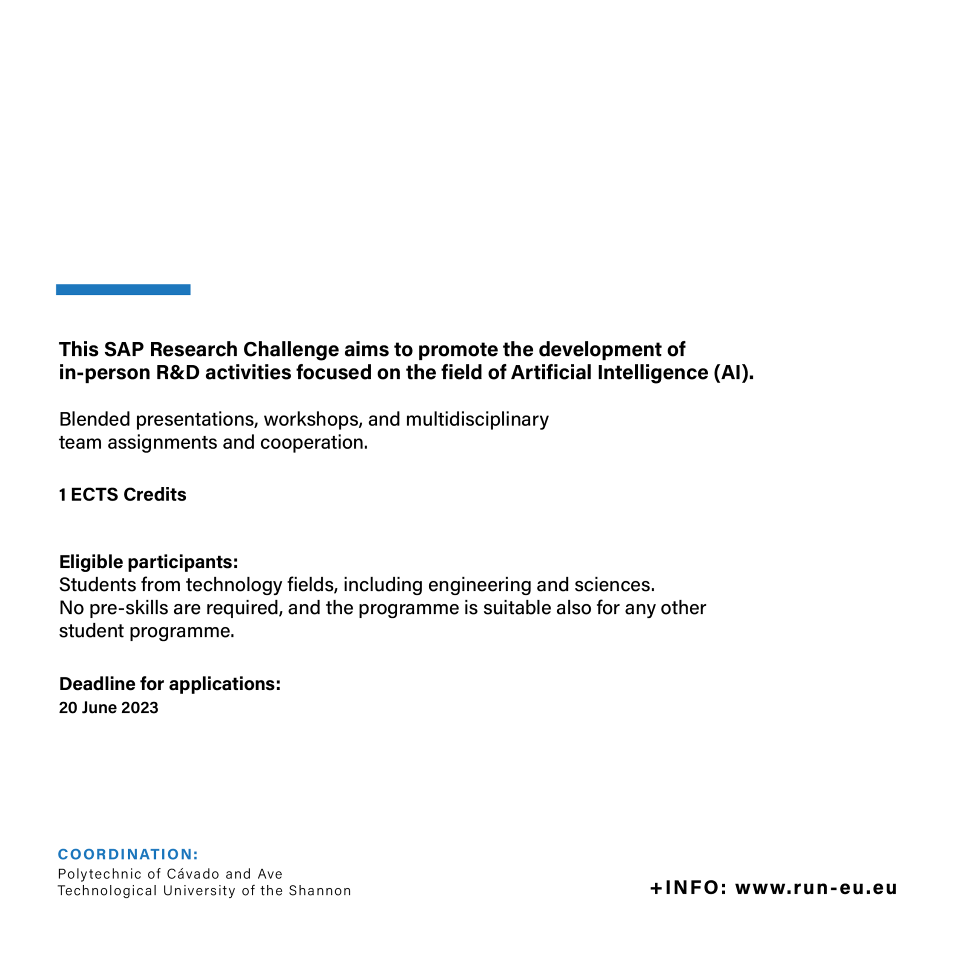 Jointly organised by the Polytechnic of Cávado and Ave (IPCA), and the Technological University of the Shannon (TUS), the SAP Research Challenge ‘Artificial Intelligence 2AI’ aims to promote the development of in-person R&D activities, focused on the field of Artificial Intelligence 2AI.