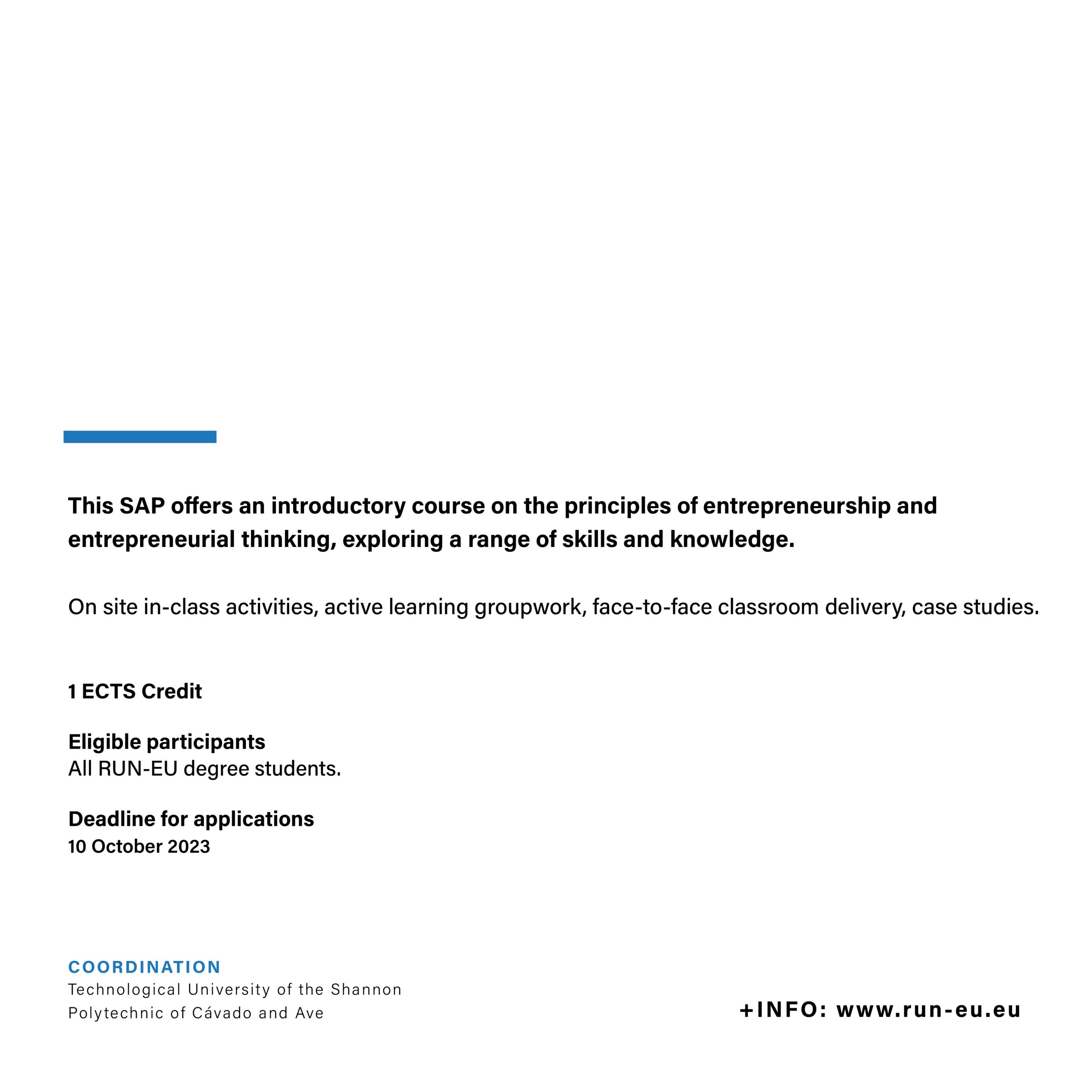 This programme will provide an experiential learning opportunity for RUN-EU students to visit an overseas partner institution and to gain a global perspective on entrepreneurship in different cultures.