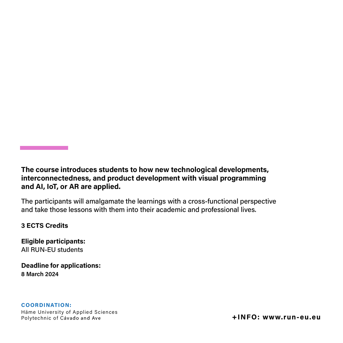 Smart Everything is a RUN-EU Short Advanced Programme (SAP) jointly coordinated by the Häme University of Applied Sciences (HAMK) and the Polytechnic University of Cávado and Ave (IPCA).