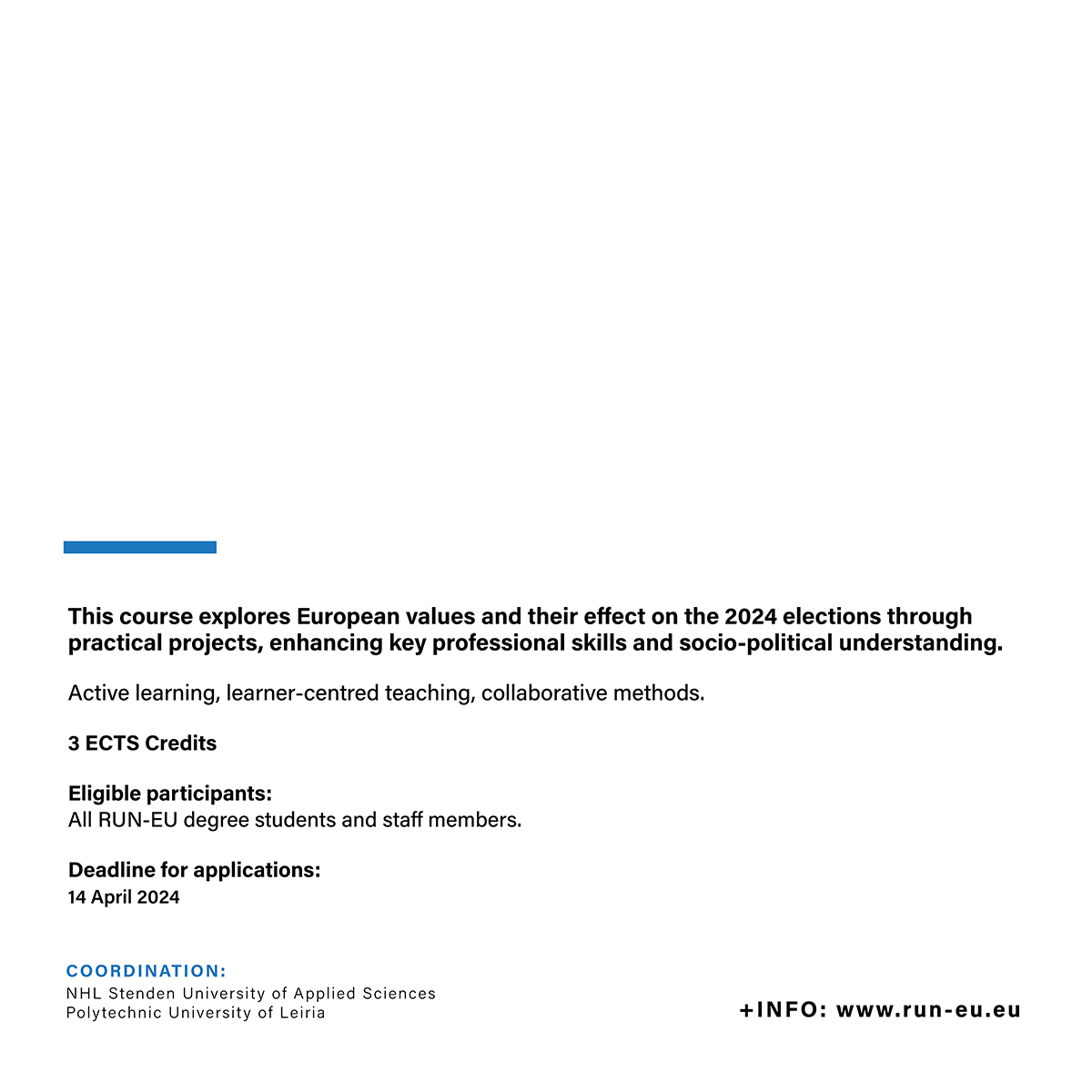 The Short Advanced Programme (SAP) ‘European Values and the 2024 European Parliament Elections’ is jointly coordinated by the NHL Stenden University of Applied Sciences (NHL Stenden) and the Polytechnic University of Leiria (IPLeiria).