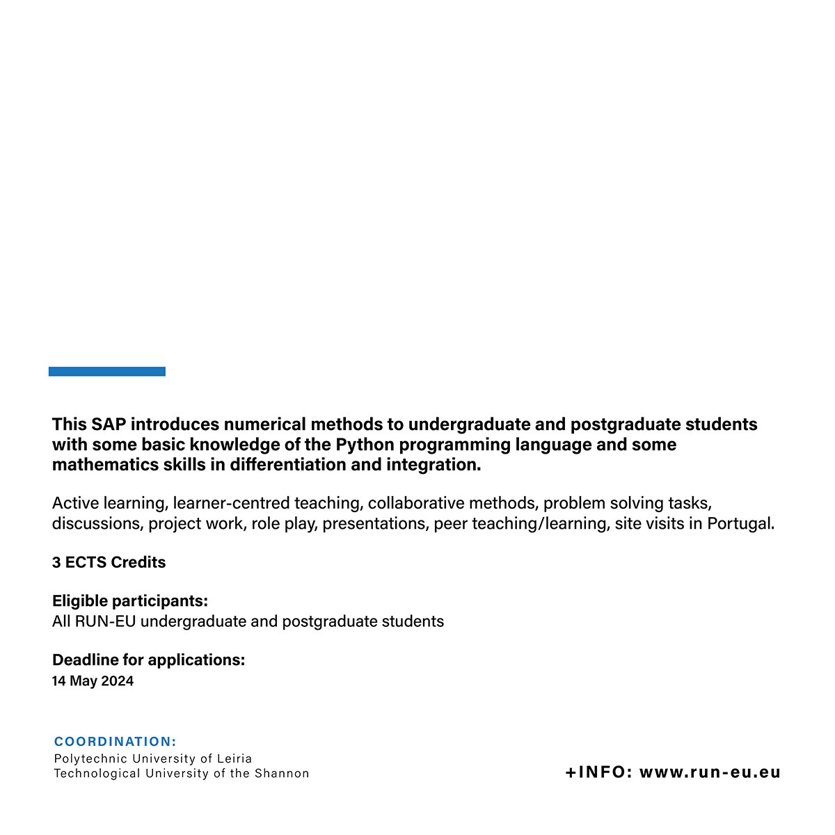 Jointly coordinated by the Polytechnic University of Leiria (IPLeiria) and the Technological University of the Shannon (TUS), the Short Advanced Programme (SAP) ‘Numerical Methods with Python Programming’ will introduce numerical methods to undergraduate and postgraduate students with some basic Python programming language skills and some mathematics skills in differentiation and integration.