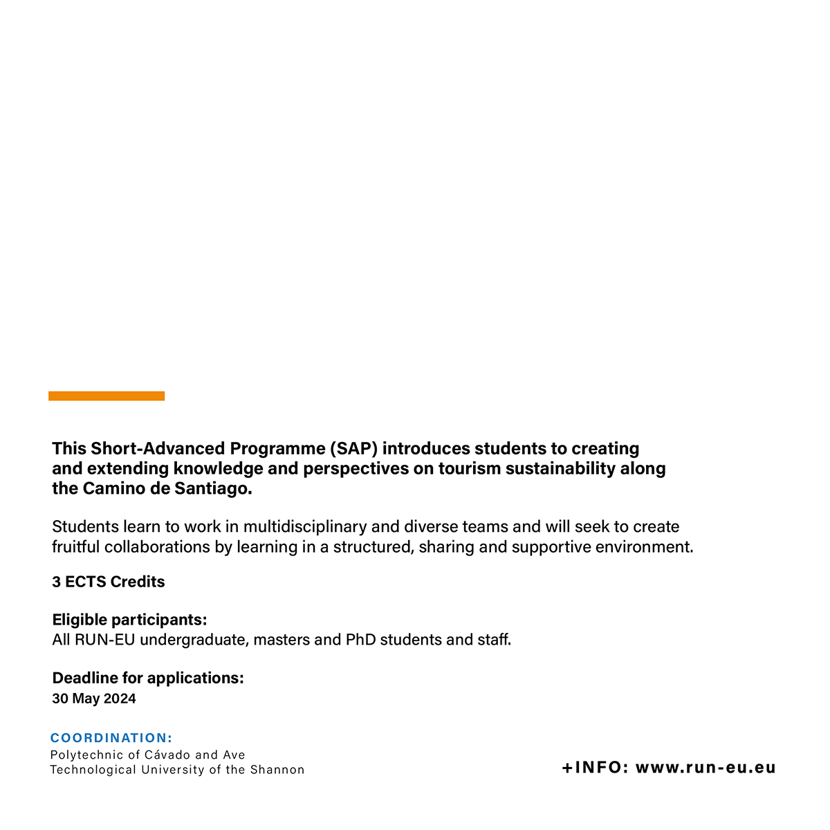 Jointly coordinated by the Polytechnic University of Cávado and Ave (IPCA) and the Technological University of the Shannon (TUS), the Short Advanced Programme (SAP) ‘Sustainability in the Context of Tourism along the Camino de Santiago’ focuses on sustainability within the Camino de Santiago tourism framework.