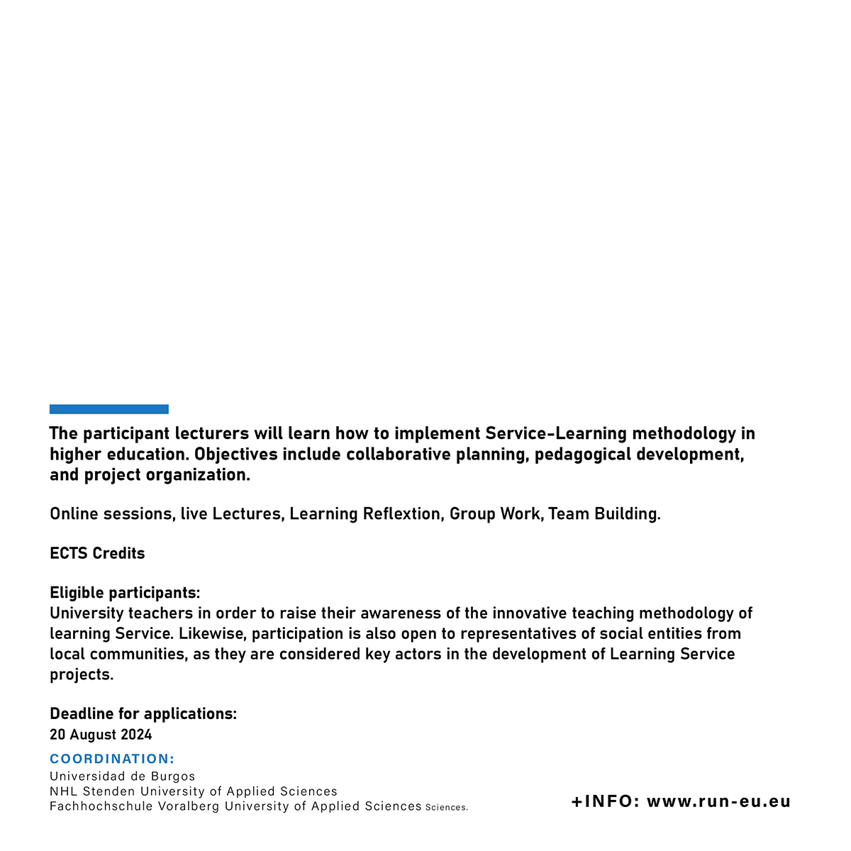 The Short Advanced Programme (SAP) ‘Service Learning Programme for Lecturers’ is jointly coordinated by the University of Burgos (UBU), the NHL Stenden University of Applied Sciences, the Vorarlberg University of Applied Sciences, and the Technological University of the Shannon.
