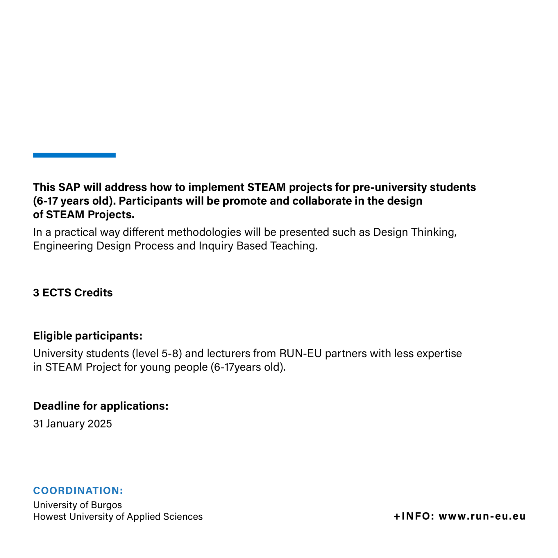 University students (level 5-8) and lecturers from RUN-EU partners with less expertise in STEAM Projects for young people (6-17 years old). Prerequisites: interest in education and working with young people (6-17 years old) in an extracurricular context; interest in any STEAM discipline.