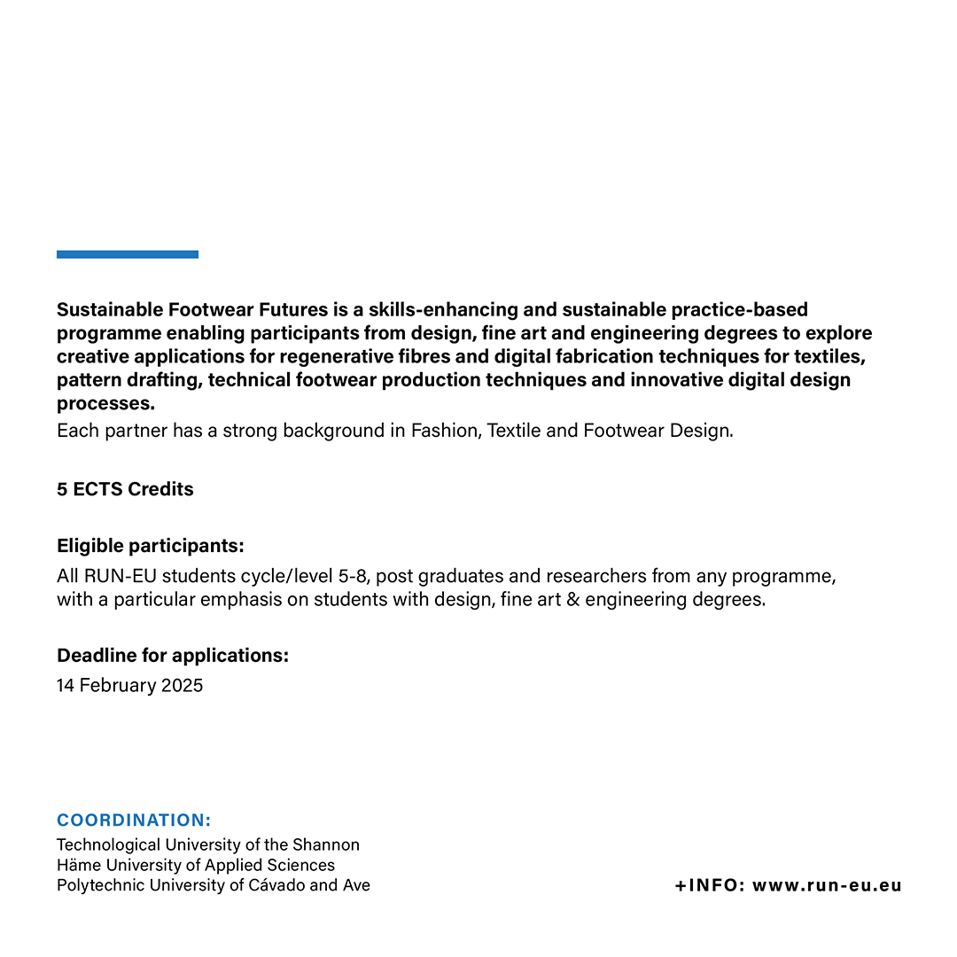 The Short Advanced Programme (SAP) ‘Sustainable Footwear Futures – 2nd edition’ is jointly coordinated by the Technological University of the Shannon (TUS), the Häme University of Applied Sciences (HAMK), and the Polytechnic University of Cávado and Ave (IPCA).