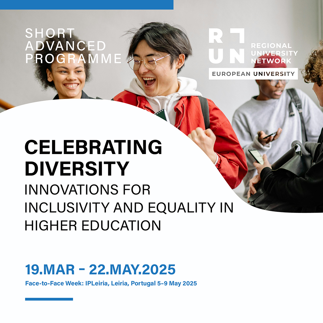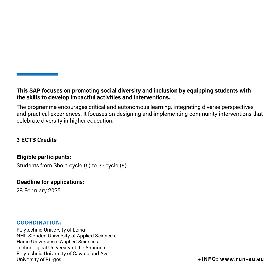 The Short Advanced Programme (SAP) ‘Celebrating Diversity: Innovations for Inclusivity and Equality in Higher Education’ is jointly coordinated by the Polytechnic University of Leiria (IPLeiria), the NHL Stenden University of Applied Sciences (NHL Stenden), the Häme University of Applied Sciences (HAMK), the Technological University of the Shannon (TUS), the Polytechnic University of Cávado and Ave (IPCA), and the University of Burgos (UBU).