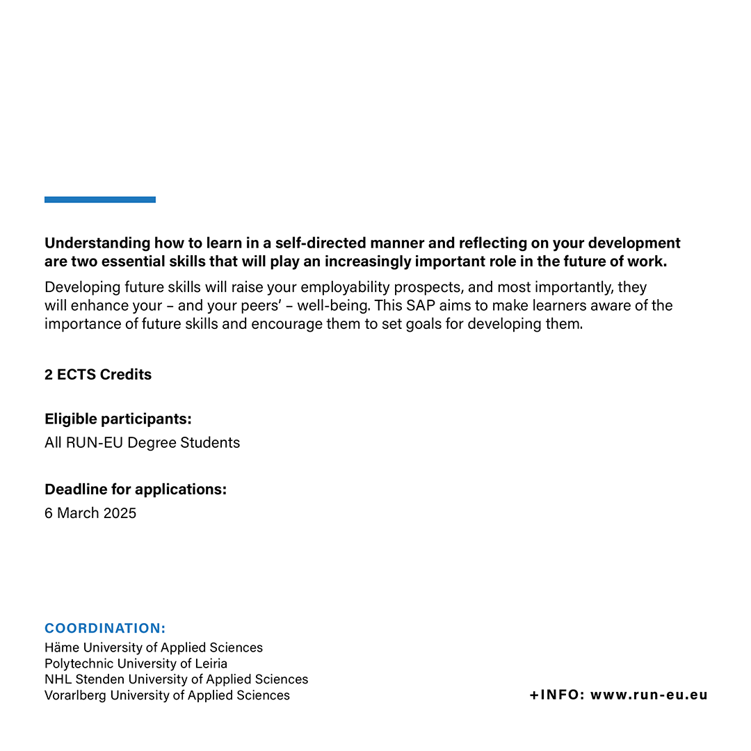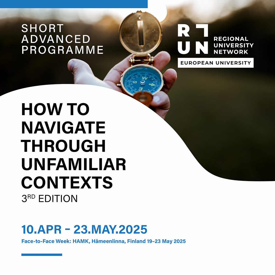 The Short Advanced Programme (SAP) ‘How to Navigate Through Unfamiliar Contexts ‘– 3rd edition is jointly coordinated by the Häme University of Applied Sciences (HAMK), the Polytechnic University of Leiria (IPLeiria), the NHL Stenden University of Applied Sciences (NHL Stenden), and the Vorarlberg University of Applied Sciences (FHV).