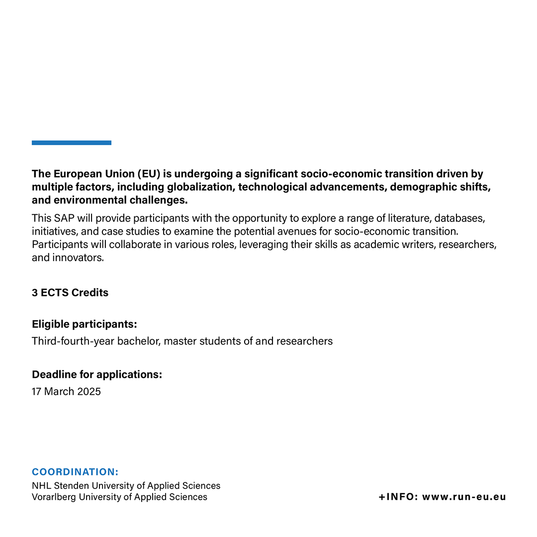 The Short Advanced Programme (SAP) ‘Socio-Economic Transition in the EU – Academic Seminar’, is jointly coordinated by the NHL Stenden University of Applied Sciences (NHL Stenden) and the Vorarlberg University of Applied Sciences (FHV).
