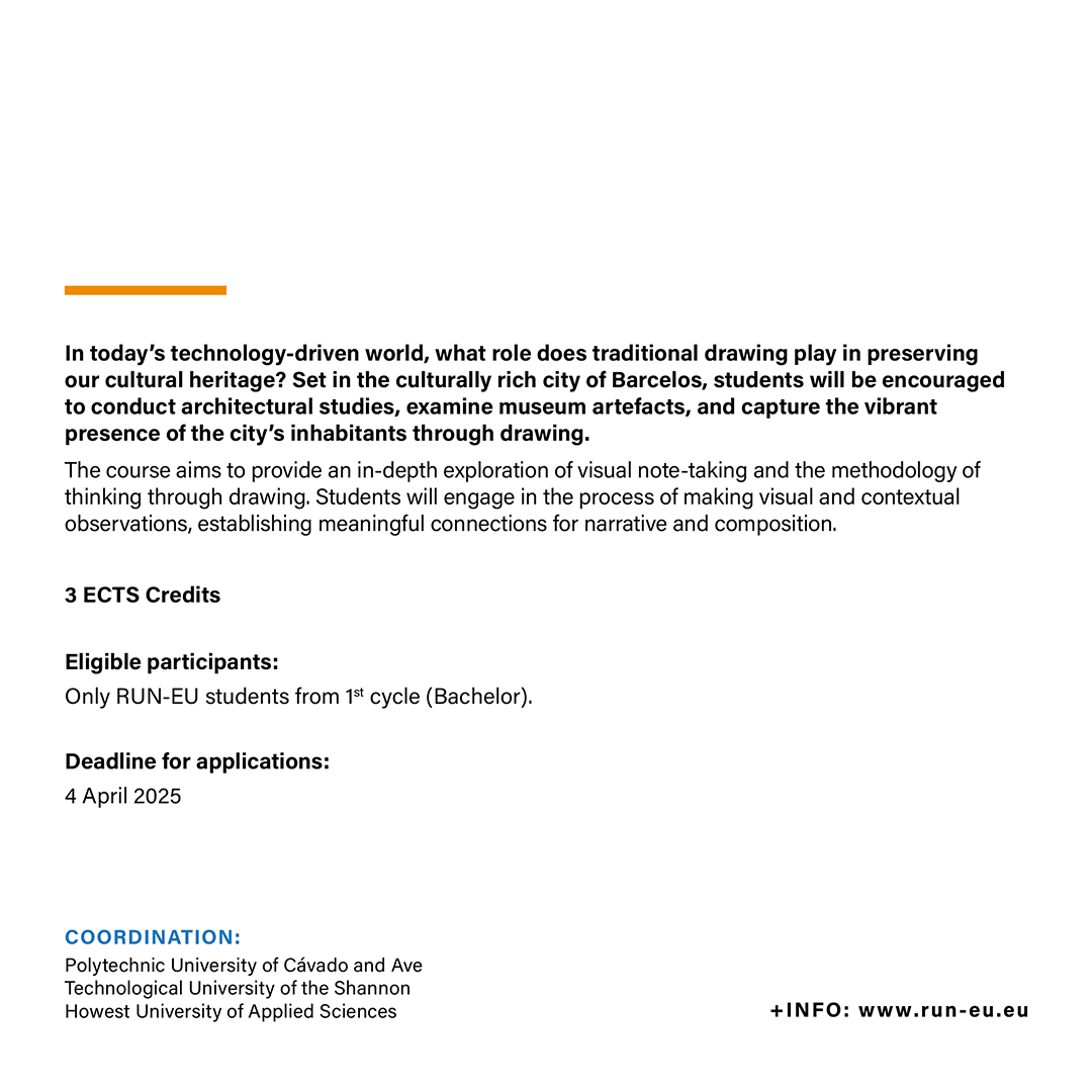The Blended Intensive Programme (BIP) ‘Drawing and Technology: The Role of Drawing and Technology Towards the Preservation of Cultural Heritage’, is jointly coordinated by the Polytechnic University of Cávado and Ave (IPCA), the Technological University of the Shannon (TUS), and the Howest University of Applied Sciences (Howest).