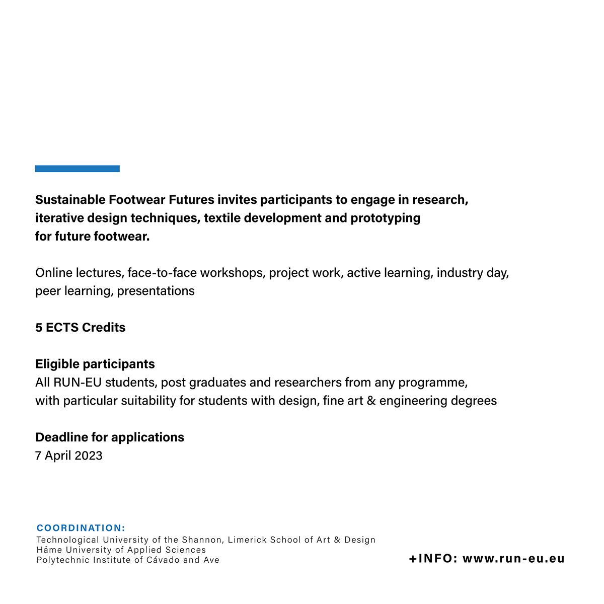 Jointly organised by the Technological University of the Shannon (TUS), the Polytechnic of Cávado and Ave (IPCA), and the Häme University of Applied Sciences (HAMK), the RUN-EU Short Advanced Programme (SAP) Sustainable Footwear Futures, is a skills enhancing and sustainable practice-based programme.